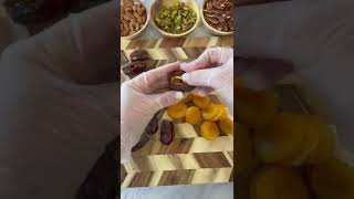 - Slice open each date and apricot without cutting all the way through. Remove the pits from the dates.