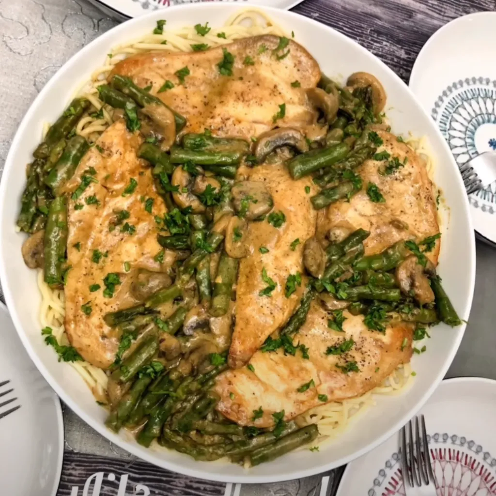 Creamy Chicken with Asparagus and Mushrooms over Spaghetti