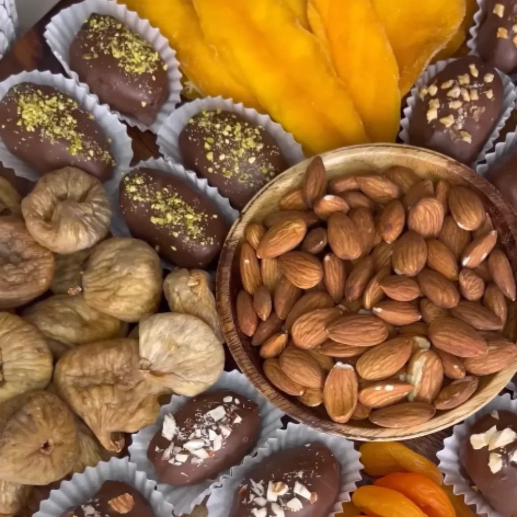 - While the chocolate is still wet, sprinkle a combination of crushed almonds, cashews, pistachios, and roasted peanuts on top of each chocolate-covered date.