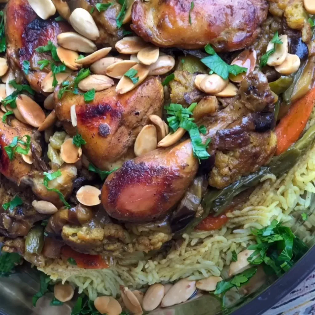 Yellow Maqloob, also known as Maqluba, is a traditional Kurdish dish that beautifully layers tender chicken, an array of fried vegetables, and fragrant basmati rice spiced to perfection. This inverted rice dish combines a medley of textures and flavors, making it a captivating centerpiece for any meal.