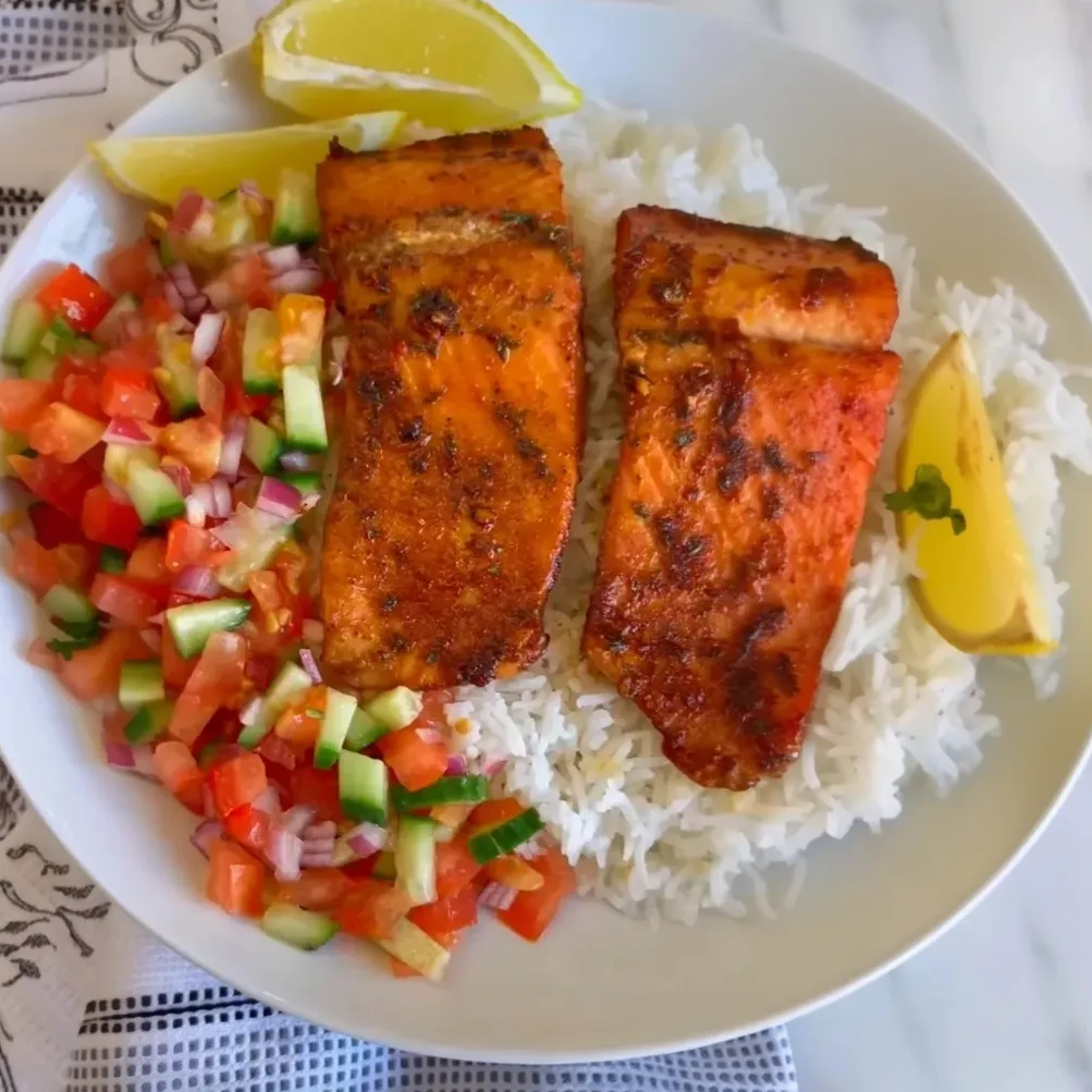 Experience a delightful, quick, and easy meal with this Oven-Baked Salmon recipe. Perfect for a family dinner, this dish combines tender, flavorful salmon with a refreshing salad and a serving of warm rice. Get ready to impress your loved ones with this dish that comes together in just 30 minutes!