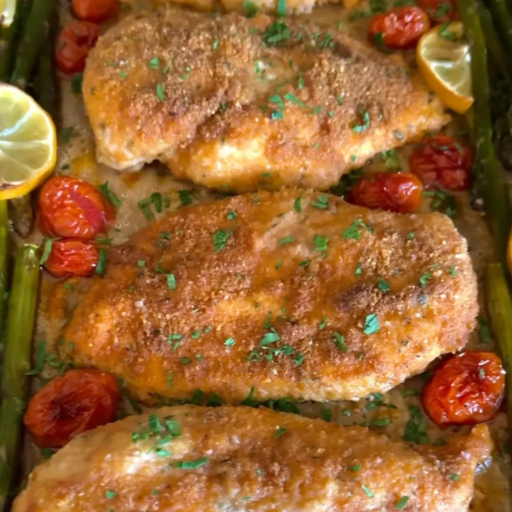 Sheet Pan Parmesan Crusted Chicken with Asparagus and Tomatoes