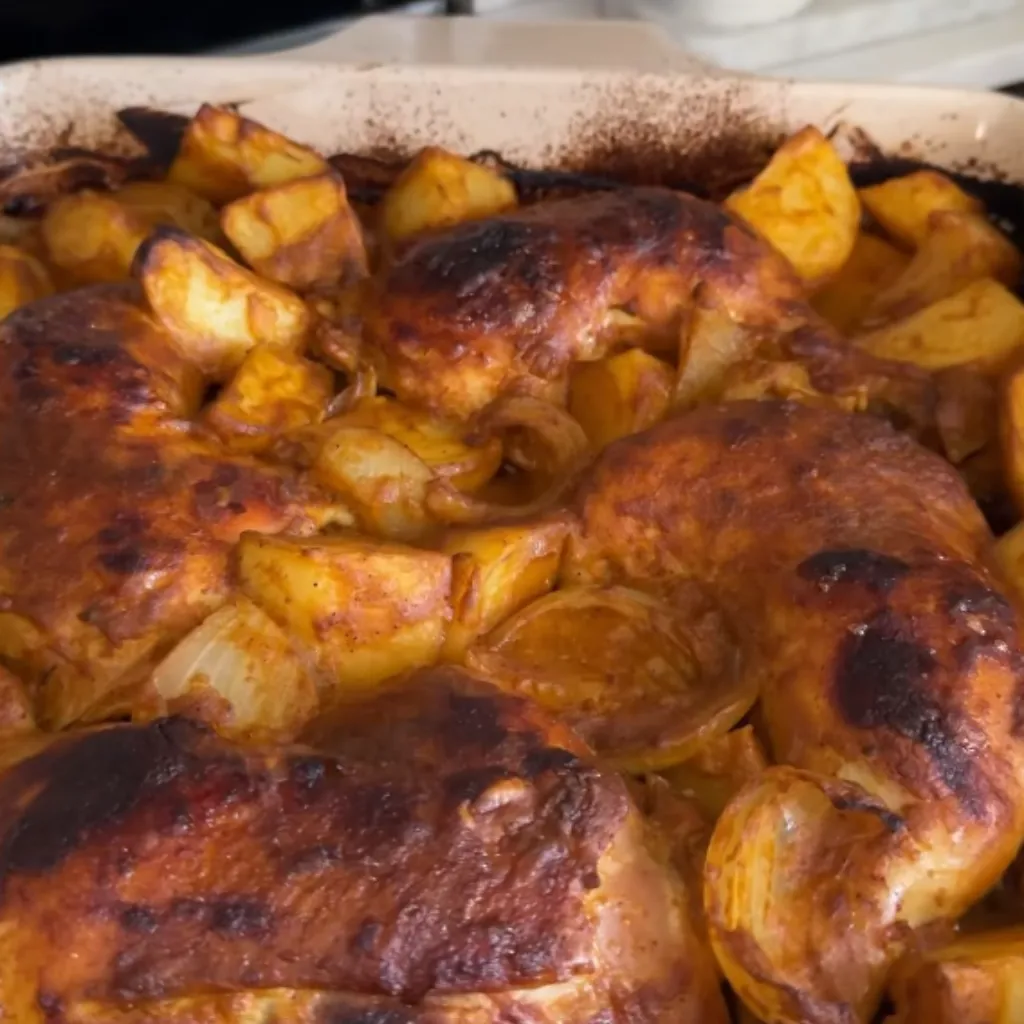 Experience the rich flavors of the Middle East with this delightful baked chicken dish. Marinated in a blend of savory spices, herbs, and yogurt, this chicken recipe is not only bursting with flavor but also easy to prepare. Perfect for a family dinner or when you wish to impress your guests, it pairs wonderfully with potatoes and onions, making for a complete, mouthwatering meal.