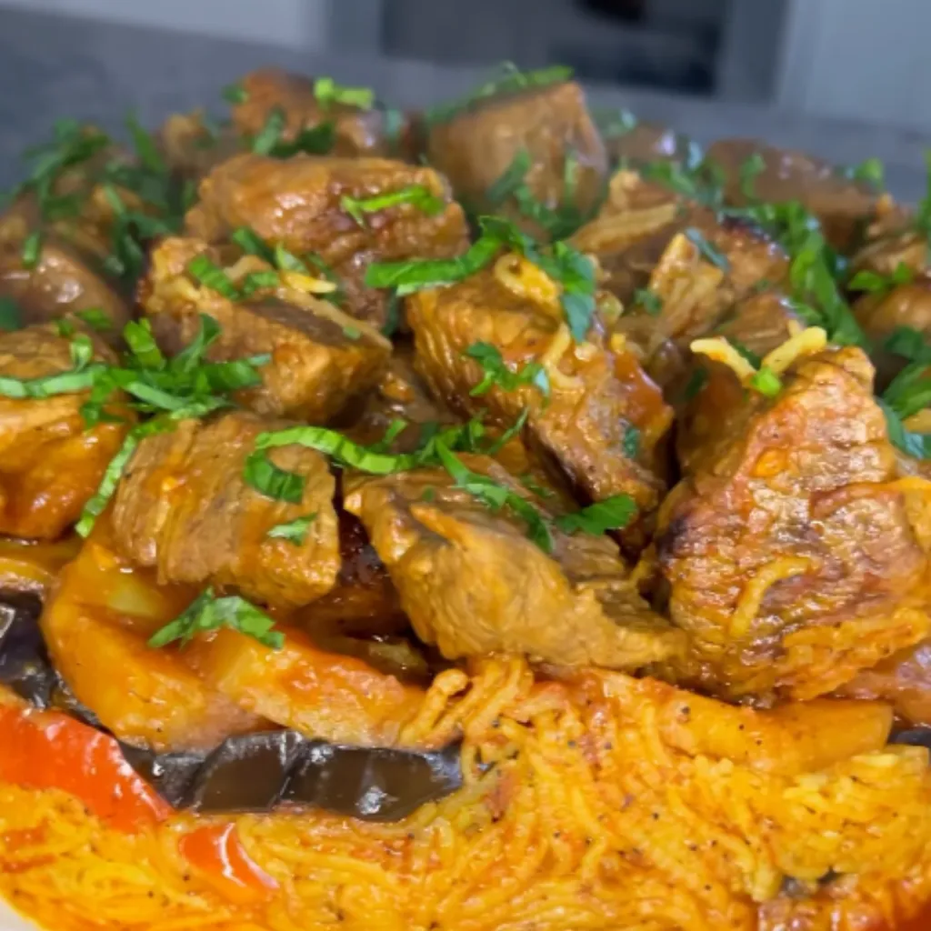 Maqluba, meaning "upside-down" in Arabic, is a beloved Middle Eastern dish known for its unique presentation and comforting flavors. Layers of seasoned beef, golden-fried vegetables, and fragrant spiced rice are cooked together and skillfully inverted to reveal a colorful and aromatic masterpiece. Perfect for family gatherings or special occasions, this dish is sure to impress with its stunning appearance and rich taste.