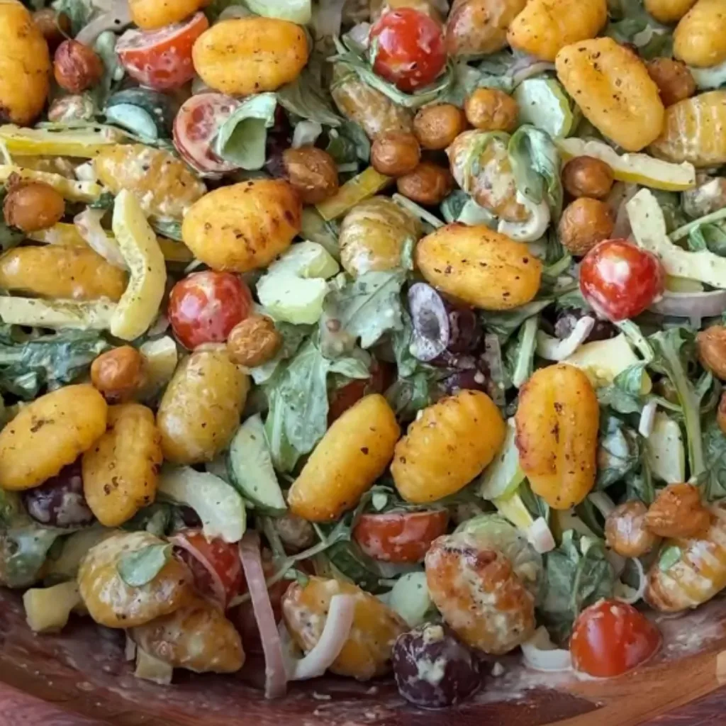 - In a large serving bowl, combine arugula, air-fried gnocchi, chickpeas, chopped vegetables, cherry tomatoes, and Kalamata olives.