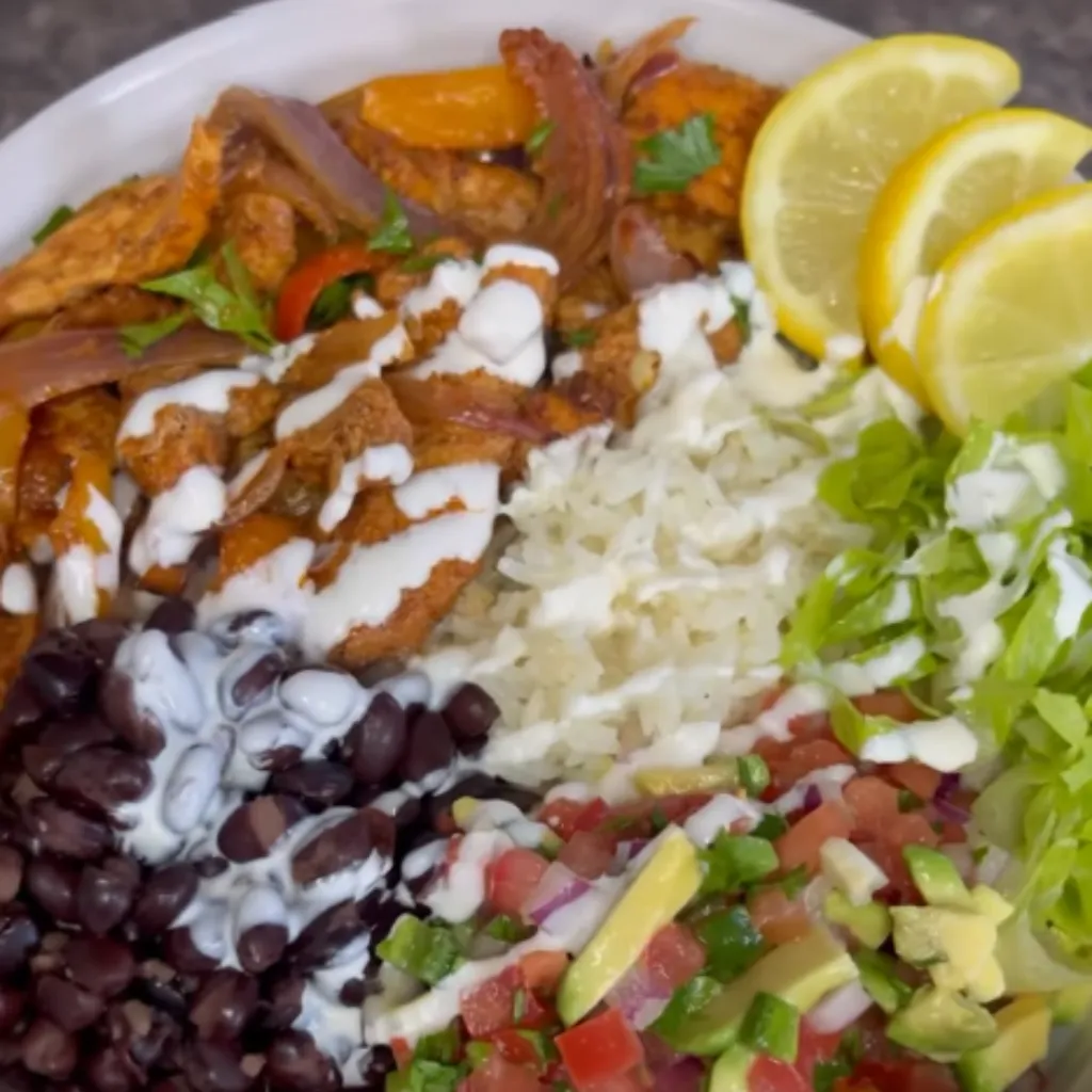 This Chicken Fajita Bowl is a vibrant and delicious dish that combines succulent, spice-infused chicken with a refreshing avocado salad. The chicken is seasoned with a blend of bold spices and baked with onions and bell peppers for a juicy, flavorful experience. The avocado salad, made with tomatoes, red onion, cilantro, and jalapeรฑo, adds a fresh, tangy contrast to the dish. Served as a bowl, this meal brings the essence of Tex-Mex cuisine to your table, offering a colorful and satisfying experience that's perfect for any occasion.