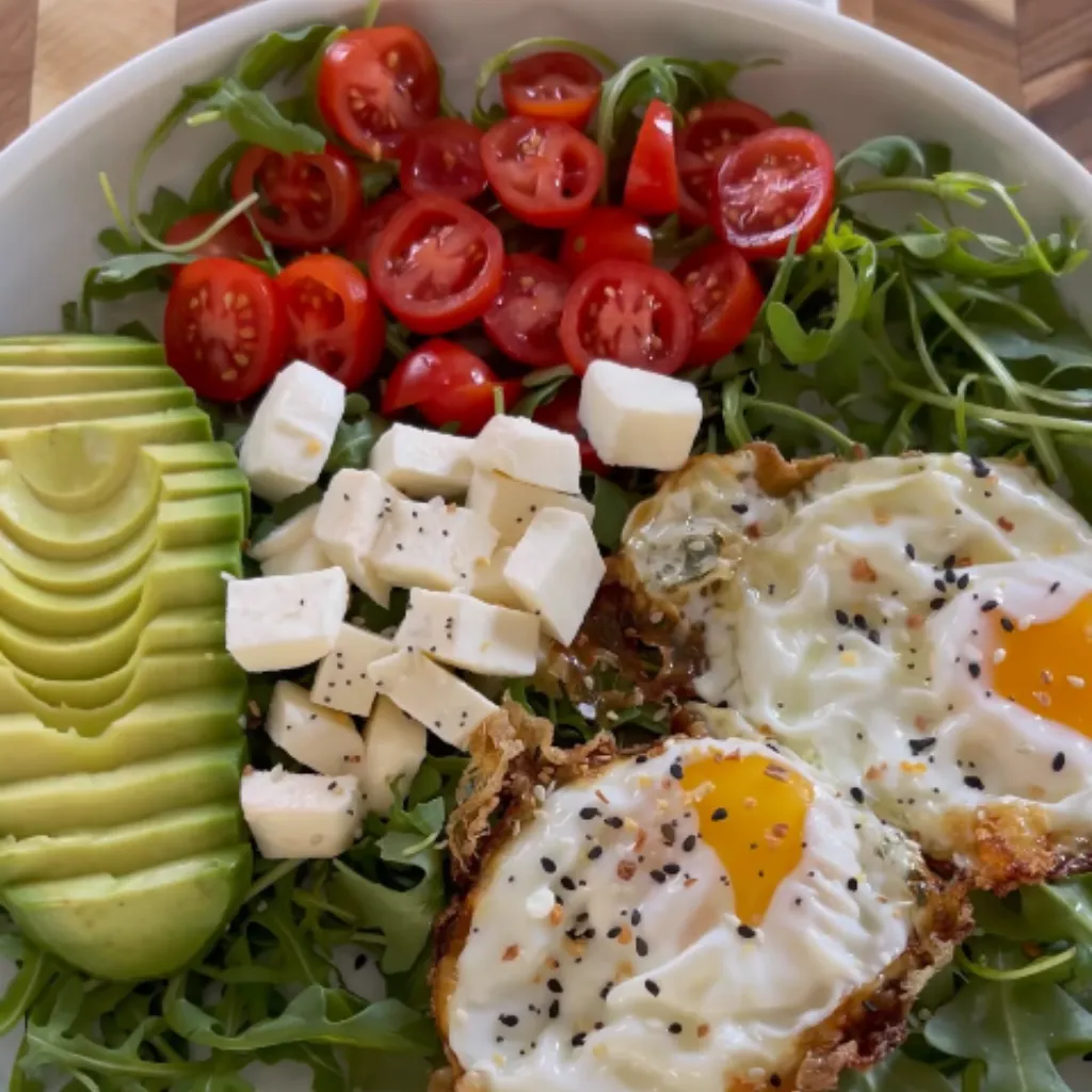 Start your day with this delightful breakfast, packed with protein and healthy fats. These perfectly crispy fried eggs are served over a fresh arugula salad, accompanied by cherry tomatoes, creamy avocado, and mozzarella cheese. All seasoned with the bold flavors of Everything Bagel seasoning. A perfect combination of taste and nutrition, this dish will energize you for the day ahead.