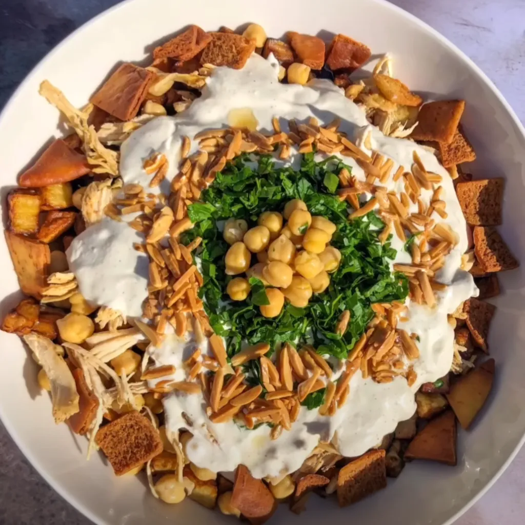 Fetteh is a delightful Middle Eastern dish that combines layers of flavors and textures. In this recipe, fried eggplant, crispy potatoes, and shredded chicken are combined with chickpeas and a creamy yogurt sauce, making a hearty, savory dish that's perfect for any occasion. The addition of toasted almonds and fresh parsley as garnish brings a delightful crunch and freshness to each bite.