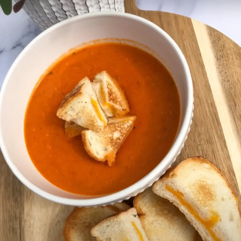 Indulge in a classic comfort meal with a modern twist: a rich and velvety tomato bisque paired with perfectly crispy grilled cheese sandwiches. This recipe combines the natural sweetness of tomatoes with aromatic herbs, creamy parmesan, and the perfect blend of cheddar and pepper jack cheeses in the sandwiches. Perfect for a cozy dinner at home or a delightful lunch.