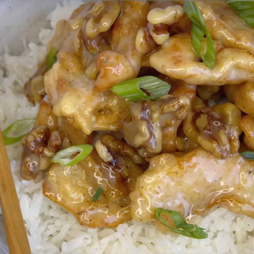 Honey Walnut Chicken is a tantalizing blend of crispy chicken and candied walnuts, drizzled with a creamy, sweet sauce. This dish marries the textures of crunchy, fried chicken with the soft crunch of walnuts, all enveloped in a luscious sauce made from mayonnaise, sweetened condensed milk, honey, and lemon juice. Served over white rice and garnished with green onions, it is a quick and delightful dinner option, perfect for satisfying the entire family with its unique combination of flavors and textures.
