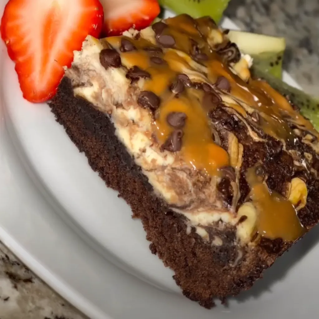 - Pour the melted caramel sauce over the cooled cheesecake brownie. Sprinkle chocolate chips on top.
